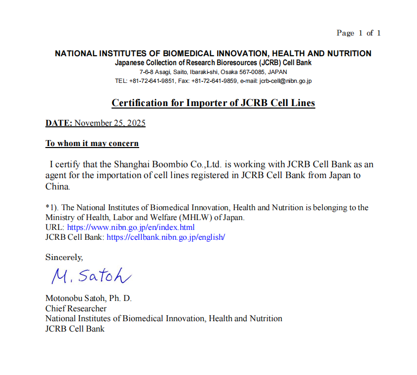 作为日本JCRB细胞库(隶属日本厚生劳动省下属机构)官方授权进口商,我们持有JCRB出具的《细胞进口代理认证文件》,从根源解决“渠道存疑、合规无据”的核心痛点!​
